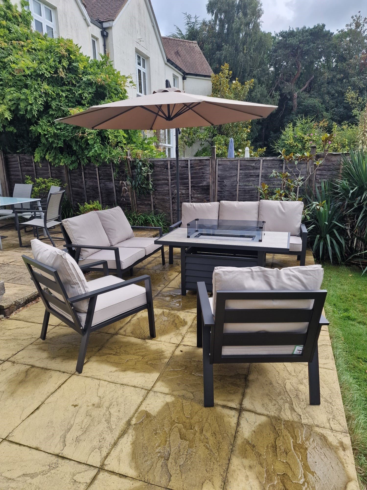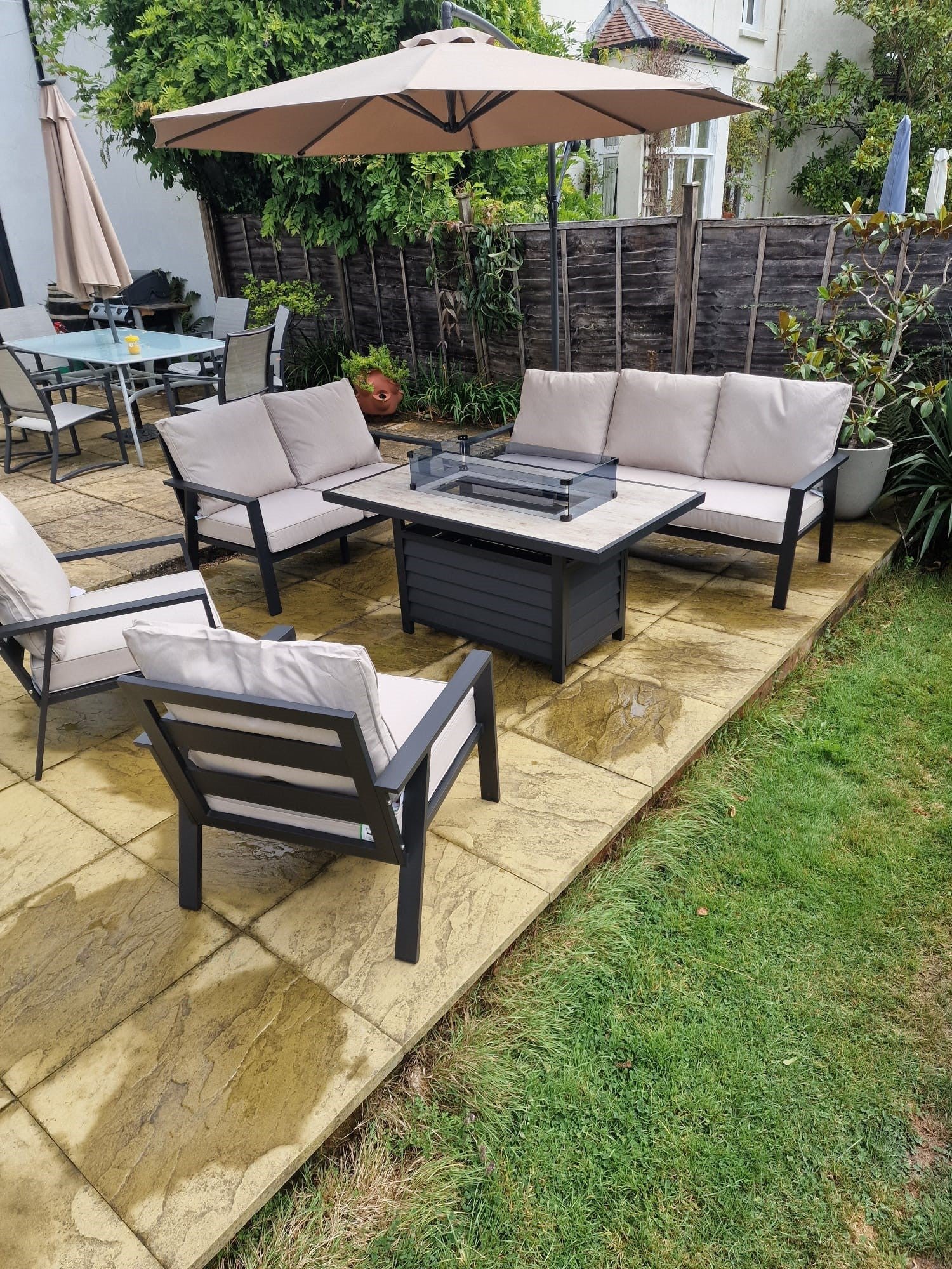 At its centre is a sleek, gas-powered fire pit table that brings warmth and a welcoming glow to your evenings. Ideal for entertaining or simply relaxing, it sets the mood for memorable gatherings and peaceful nights under the stars.